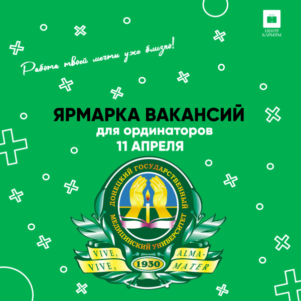 11.04.2025 г. в 13.00 на базе ФГБОУ ВО ДонГМУ Минздрава России по адресу: г. Донецк, пр-т Ильича 16, учебный корпус № 1, Большой наклонный зал (БНЗ), состоится Ярмарка вакансий 2025 для выпускников ординатуры.