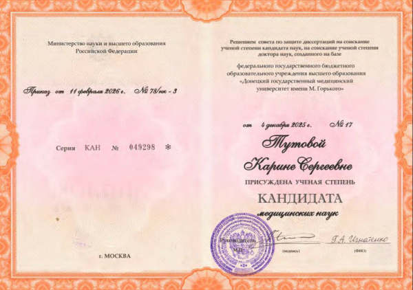 Решением совета по защите диссертаций на соискание ученой степени кандидата наук, на соискание ученой степени доктора наук, созданного на базе федерального государственного бюджетного образовательного учреждения высшего образования «Донецкий государственный медицинский университет имени М. Горького» ассистенту кафедры стоматологии детского возраста и хирургической стоматологии Карине Сергеевне Тутовой была присуждена ученая степень кандидата медицинских наук.