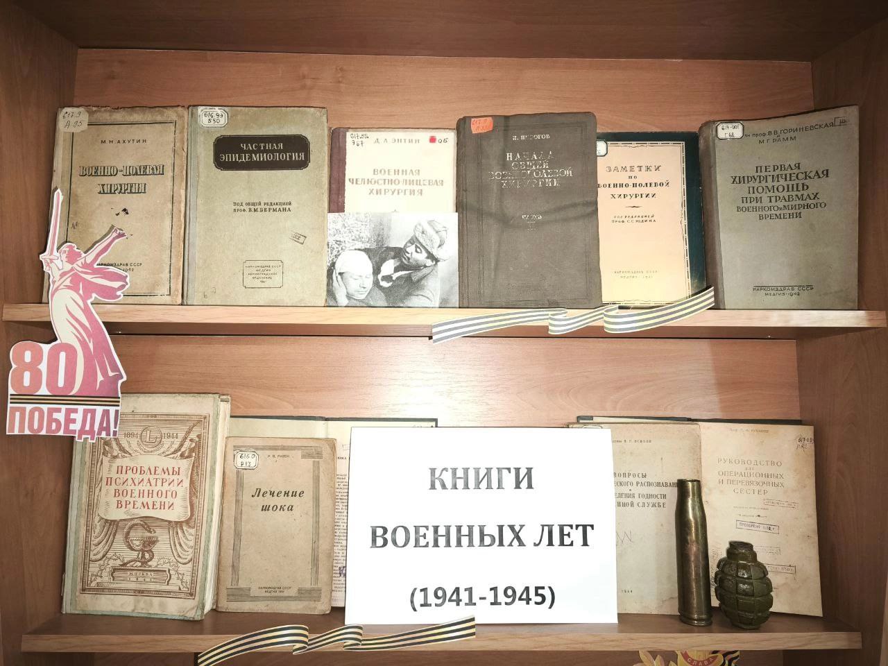 Здесь представлены уникальные экземпляры, которые не только передают дух времени, но и являются важными документами, сохранившими память о тяжелых испытаниях и героизме нашего народа. Книги, представленные на выставке, были изданы в условиях войны с 1941 по 1945 год, что придает им особую ценность и значимость, они не только отражают достижения медицины того времени, но и являются свидетельствами того, как медицина адаптировалась к экстремальным условиям военного времени и помогают осознать масштабы человеческих страданий и мужество тех, кто работал на передовой.