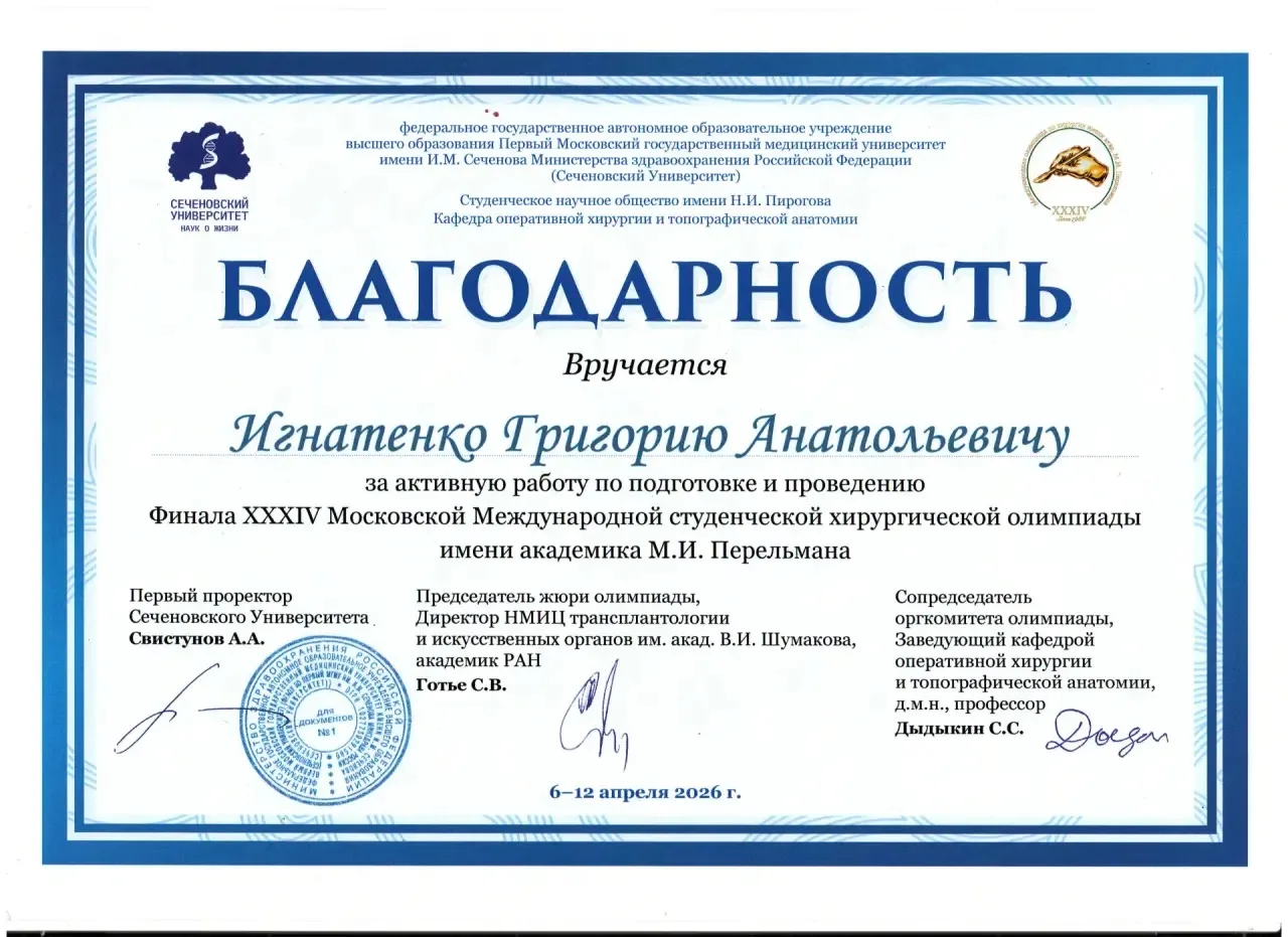 Участие в мероприятии стало возможным при поддержке ректора ДонГМУ, академика РАН, за что Григорий Анатольевич был отмечен благодарностью за активную работу по подготовке и проведению финала XXXIV Московской Международной студенческой хирургической олимпиады имени академика М. И. Перельмана.