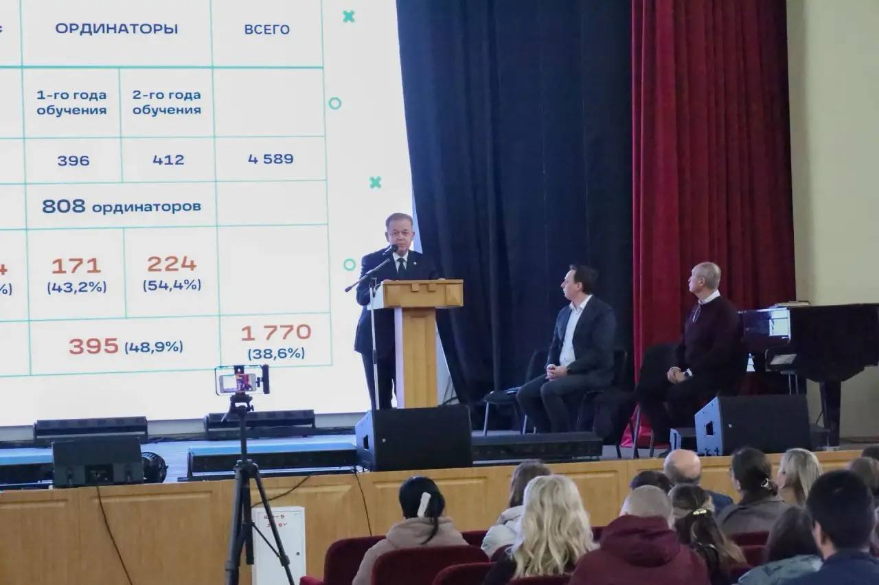 Открывая мероприятие, ректор представил статистику, демонстрирующую эффективность интеграции обучения и профессиональной деятельности. На сегодняшний день 38,6% от общего числа обучающихся (1770 человек) уже работают в системе здравоохранения. Почти половина ординаторов (48,9%) совмещают учебу с практической работой.
