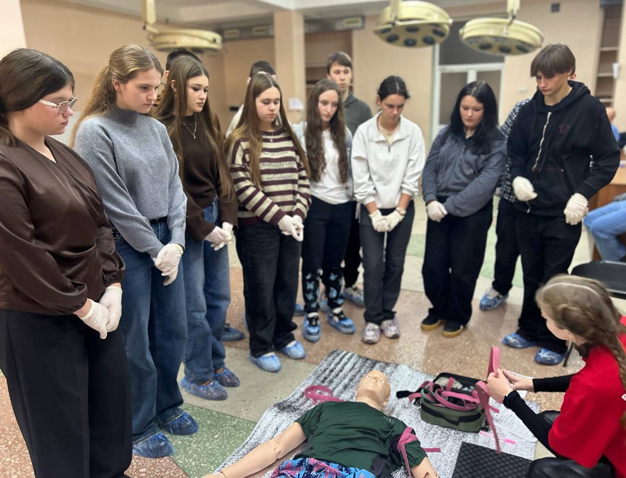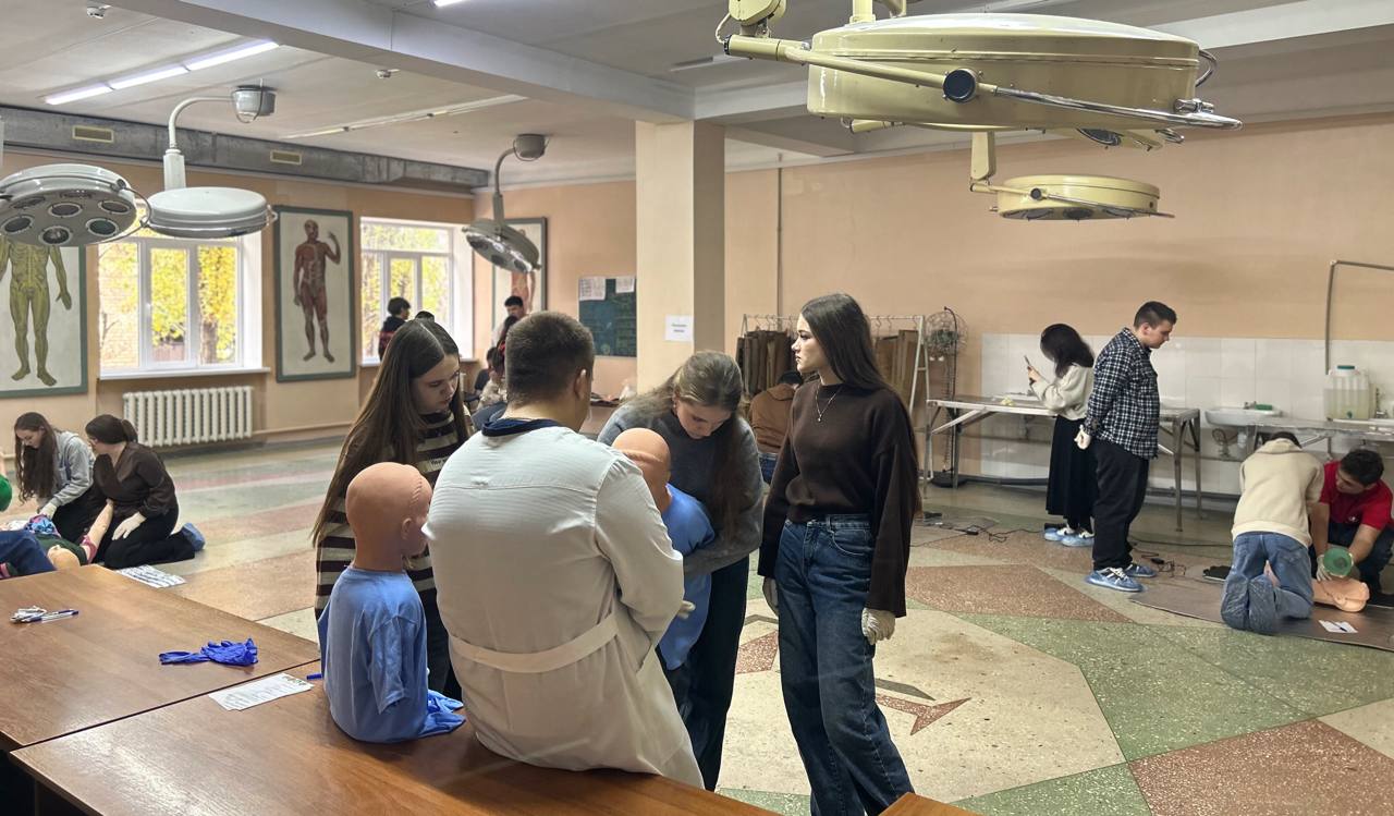 Под руководством студентов старших курсов участники отработали навыки первой помощи.