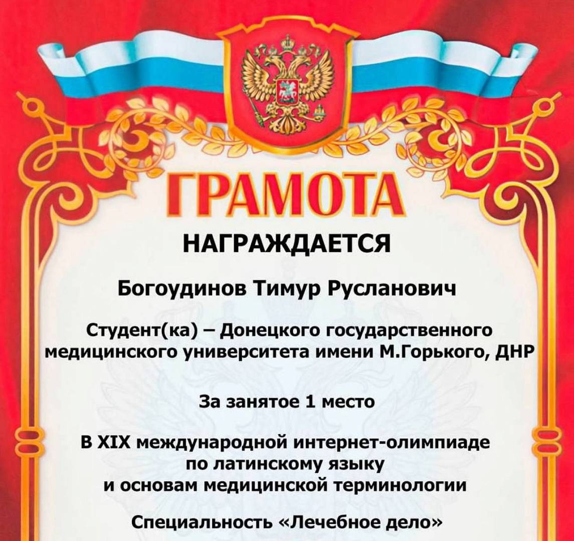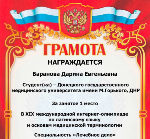 Студенты I курса лечебного факультета № 1 ДонГМУ Д. Баранова и Т. Богоудинов одержали победу в XIX Международной интернет-олимпиаде по латинскому языку и основам медицинской терминологии.