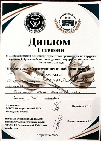 Студенты Донецкого государственного медицинского университета имени М. Горького приняли участие в масштабном I Прикаспийском молодёжном хирургическом форуме. По итогам конкурса «Сердечно-легочная реанимация» I место заняли Егор Салюк и Отари Чачанидзе, представители лечебного факультета № 2.