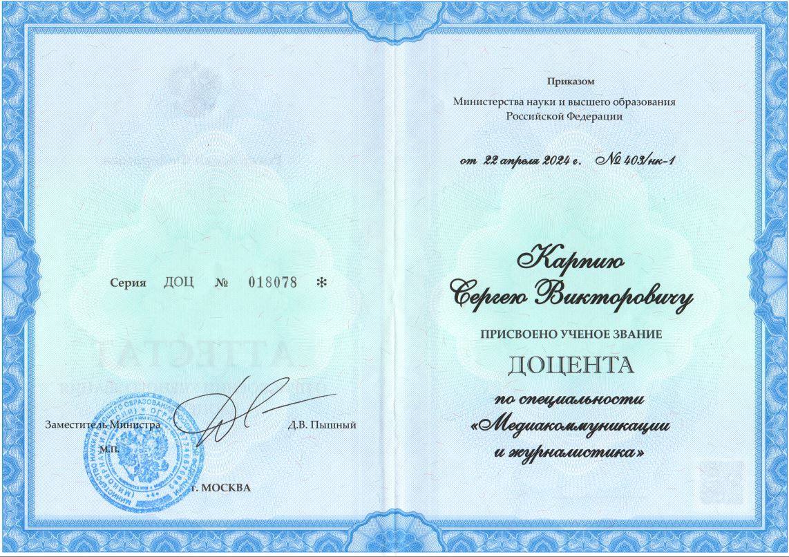 Это уже второе ученое звание доцента, присвоенное Сергею Викторовичу. Ранее, 22 апреля 2024 года, Приказом Министерства науки и высшего образования Российской Федерации ему было присвоено ученое звание доцента по специальности «Медиакоммуникации и журналистика».