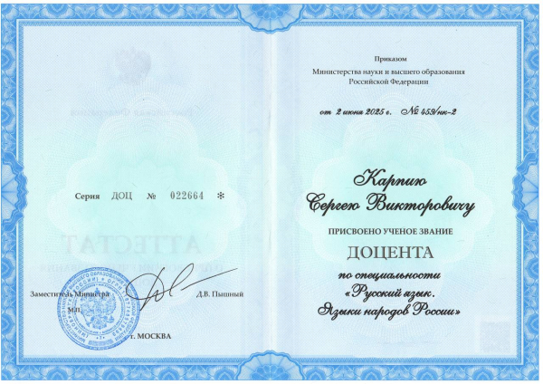 Приказом Министерства науки и высшего образования Российской Федерации от 2 июня 2025 года № 459/нк-2 Карпию Сергею Викторовичу присвоено ученое звание доцента по специальности «Русский язык. Языки народов России»