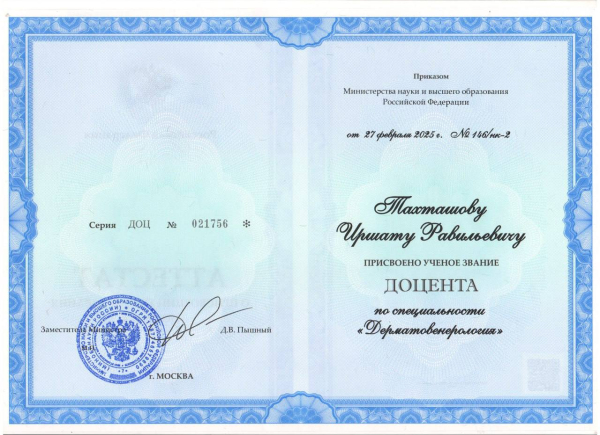 Приказом Министерства науки и высшего образования Российской Федерации от 27 февраля 2025 года № 146/нк-2 Тахташову Иршату Равильевичу присвоено ученое звание доцента по специальности «Дерматовенерология»