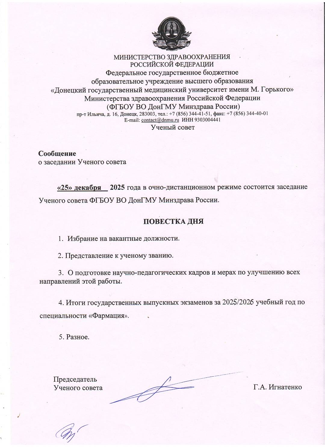 Ученый совет Университета состоится 25.12.2025 г. в очно-дистанционном режиме