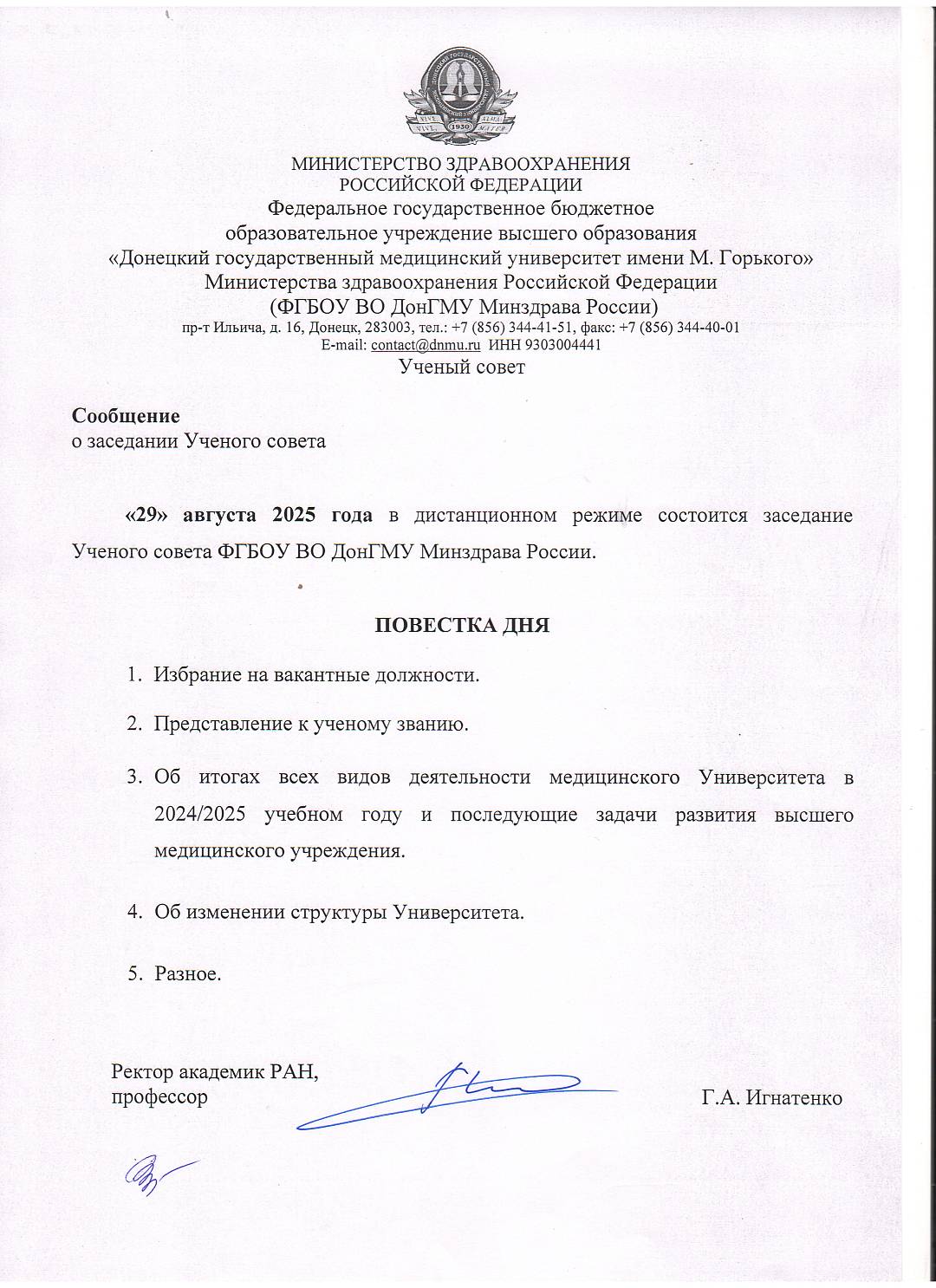 Ученый совет Университета состоится 29.08.2025 г. в дистанционном режиме