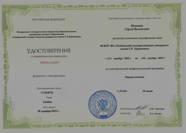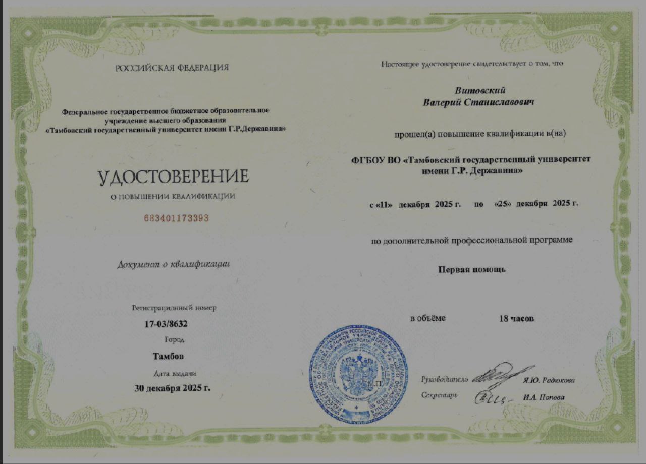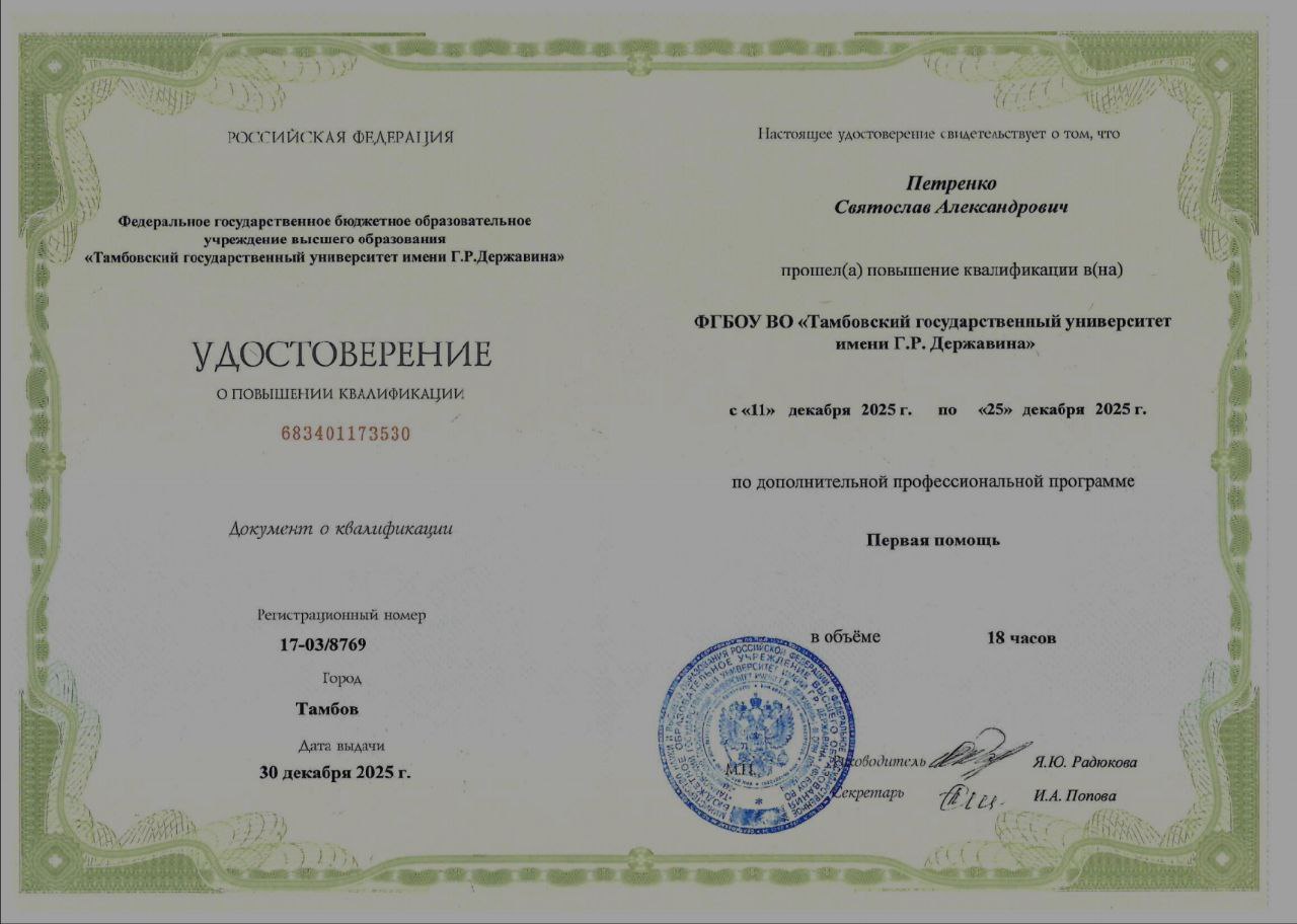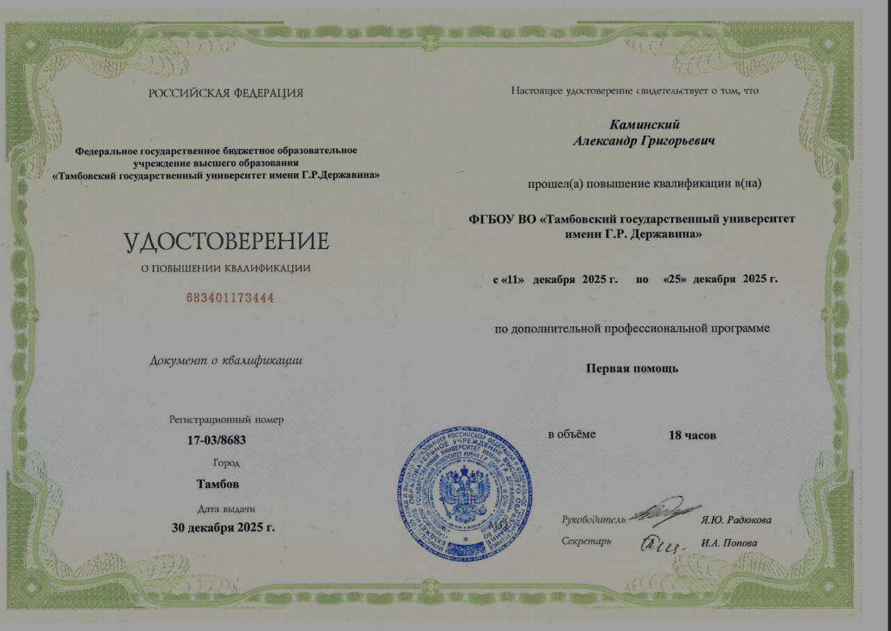 Сотрудники Донецкого государственного медицинского университета имени М. Горького прошли курсы повышения квалификации по программе «Первая помощь» в ФГБОУ ВО «Тамбовский государственный университет имени Г. Р. Державина».