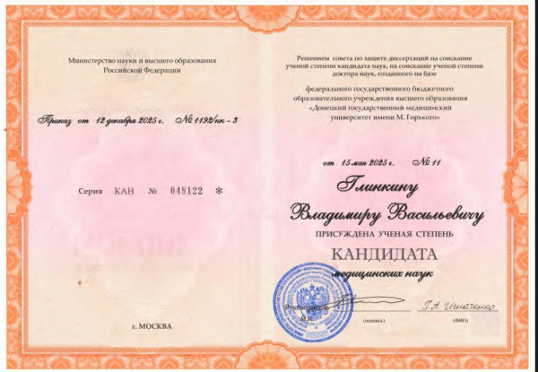 Решением совета по защите диссертаций на соискание ученой степени кандидата наук, на соискание ученой степени доктора наук, созданного на базе федерального государственного бюджетного образовательного учреждения высшего образования «Донецкий государственный медицинский университет имени М. Горького», Владимиру Васильевичу Глинкину присуждена ученая степень кандидата медицинских наук.